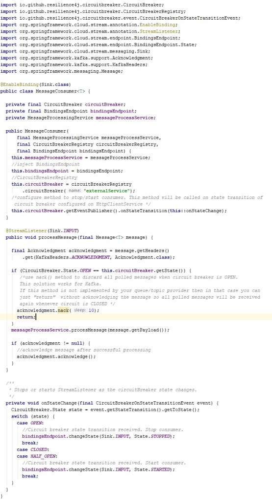 Following code snippet uses resilience4J api for circuit breaker implementation & spring-cloud-stream for consumer implementation –