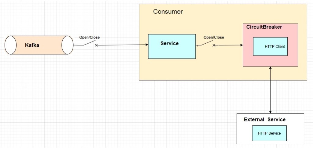 I have Kafka consumer implemented using spring-cloud-stream. Consumer code connects to external HTTP service( this can be any external/internal dependent service). When such service is down, you want to stop consuming messages from Queue/Topic. The Circuit Breaker is configured on this layer. As multiple messages start failing when external HTTP service is down then circuit breaker gets OPEN(circuit breaker between Consumer Service & External Service) and on state transition(CLOSE to OPEN/ HALF_OPEN ) of this circuit breaker, stop consumer. so no more messages will be processed until circuit is closed again.